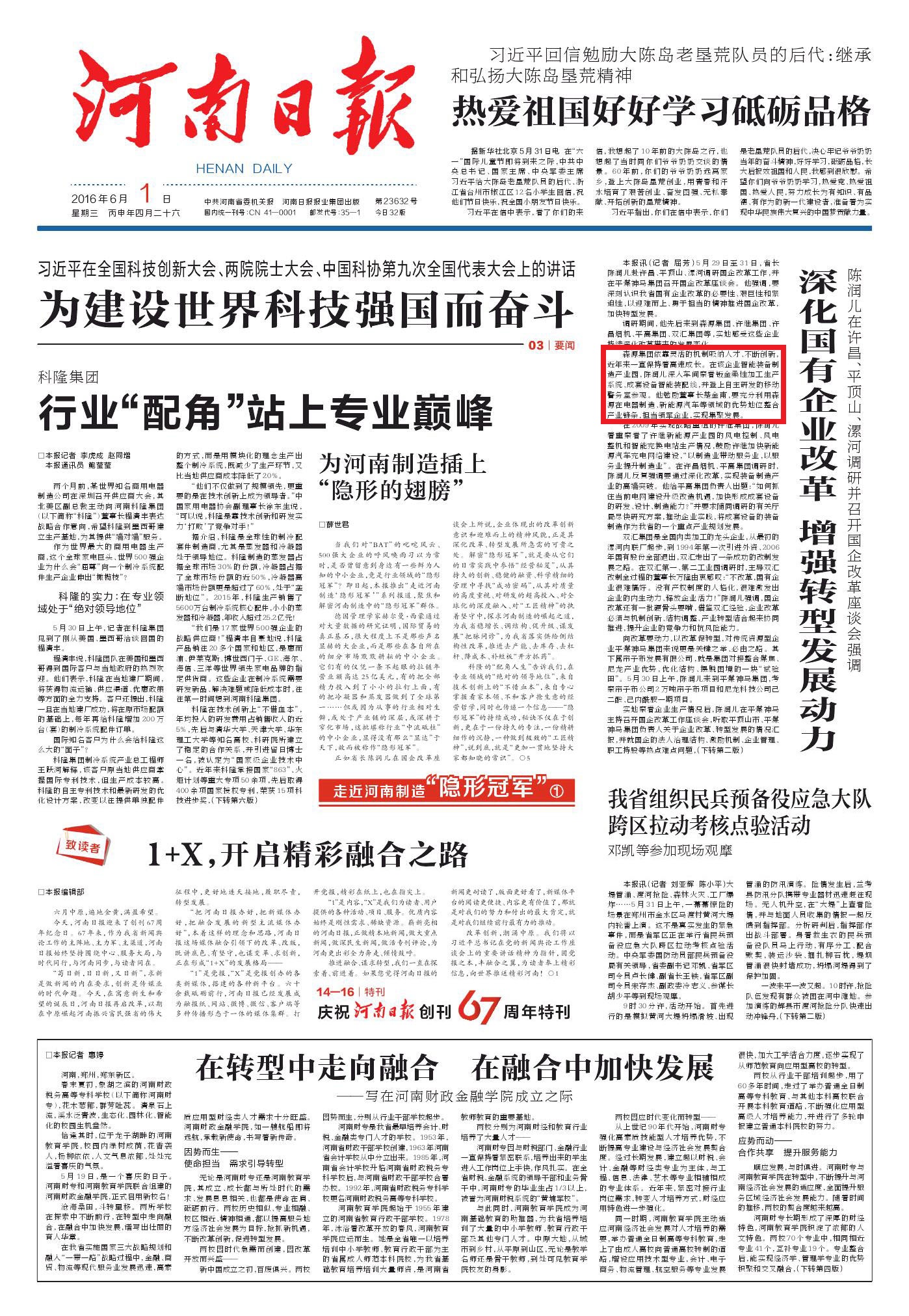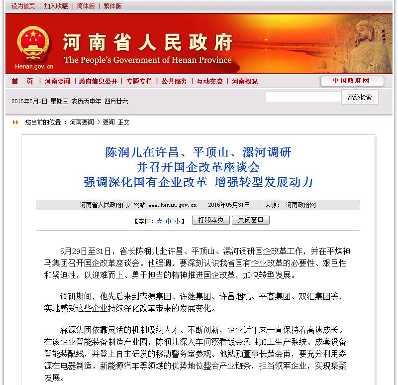 河南日报头版报道/河南省人民政府门户网站河南要闻——河南省省长陈润儿一行视察调研易游(中国)集团等企业