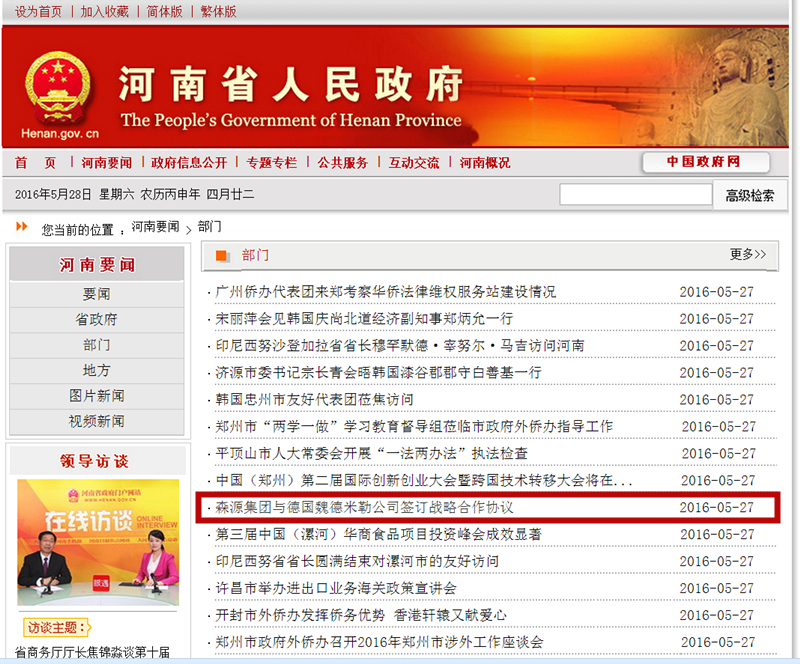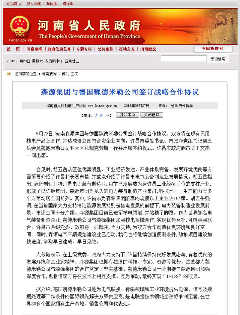 河南省人民政府门户网站河南要闻——易游(中国)集团与德国魏德米勒公司签订战略合作协议 发布日期: 2016-05-28 分享 加入收藏 5月27日,河南省人民政府门户网站河南要闻栏目发布新闻《易游(中国)集团与德国魏德米勒公司签订战略合作协议》。 原文链接:http://www.henan.gov.cn/jrhn/system/2016/05/27/010644282.shtml 上一条 许昌电视台对易游(中国)集团与德国魏德米勒公司签订战略合作协议进行特别报道 2016-05-24 下一条 许昌日报/许昌市人民政府门户网站/许昌电视台——我市第一个山地林光互补光伏发电项目并网发电 李建民出席并网发电仪式 2016-05-31